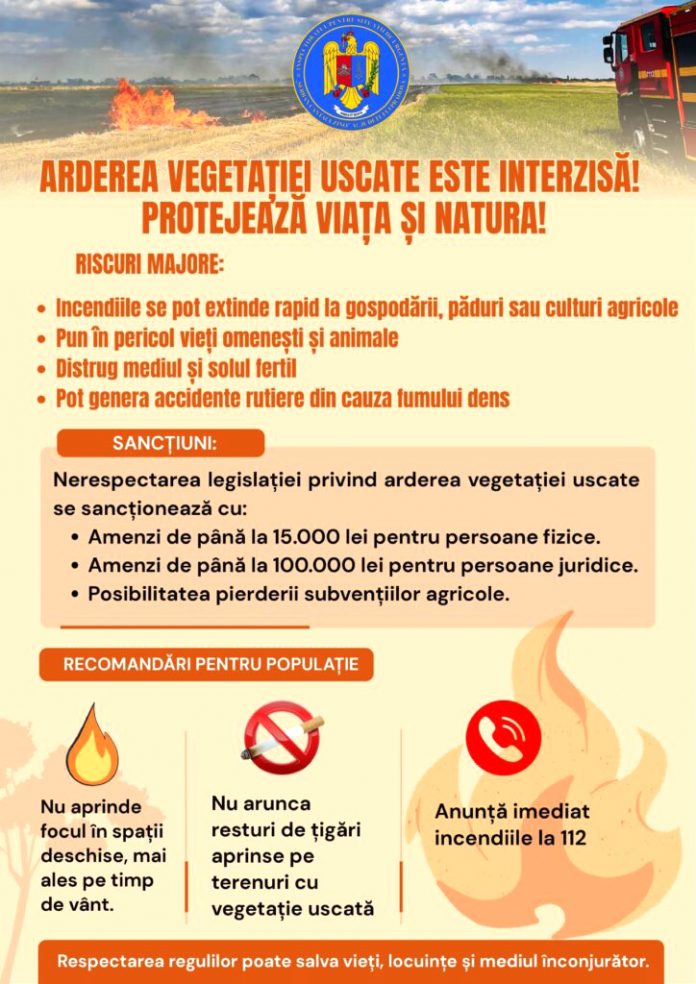 Prin intermediul unui comunicat de presă, Primăria Ploiești reamintește cetățenilor că este interzisă arderea vegetației uscate, a miriștilor și a resturilor vegetale, acțiuni ce pot reprezenta un risc semnificativ de incendiu. În acest context au fost scoase în evidență informațiile transmise de către Inspectoratul pentru Situații de Urgență “Șerban Cantacuzino” al județului Prahova, referitoare la faptul că arderea miriștii, a vegetației uscate şi a resturilor vegetale se execută numai după obținerea permisului de lucru cu focul, conform prevederilor Normelor generale de apărare împotriva incendiilor, aprobate prin Ordinul ministrului administrației şi internelor nr. 163/2007. ”Distrugerea prin ardere a deșeurilor, resturilor menajere şi vegetației uscate se efectuează cu respectarea prevederilor art.52, alin.3, lit. b şi art.94, alin1, lit. n din Legea nr.265/2006 pentru aprobarea O.U.G. nr.195/2005 privind protecția mediului, care se referă la obligativitatea obținerii acceptului Agenției de Protecția Mediului şi informarea în prealabil a Serviciului Voluntar pentru Situații de Urgență în cazul arderii miriștilor, stufului sau vegetației ierboase, respectiv interzicerea folosirii focului deschis pe teritoriul ariilor naturale protejate”, se precizează în comunicat. Așa cum s-a subliniat, riscurile arderii necontrolate a vegetației uscate sunt majore, întrucât incendiile se pot extinde rapid la gospodării, păduri, culturi agricole; este un real pericol pentru viețile omenești și pentru animale; se înregistrează distrugeri pentru mediu și solul fertil, se pot genera accidente rutiere din cauza fumului gros.”Cetățenii sunt obligați să respecte normele care interzic arderea vegetației uscate. În caz contrar, amenzile sunt în cuantum de până la 15.000 lei pentru persoanele fizice și de până la 100.000 lei pentru persoanele juridice. De asemenea, pentru agricultori există posibilitatea pierderii subvențiilor din domeniu. Astfel, recomandările pentru populație pentru evitarea producerii incendiilor sunt următoarele: nu aprindeți focul în spații deschide, mai ales pe timp de vânt; nu aruncați resturi de țigări aprinse pe terenuri cu vegetație uscată; în cazul în care sesizați un incendiu necontrolat apelați numărul de urgență 112 pentru a solicita ajutor”, au mai menționat reprezentanții Primăriei Ploiești.