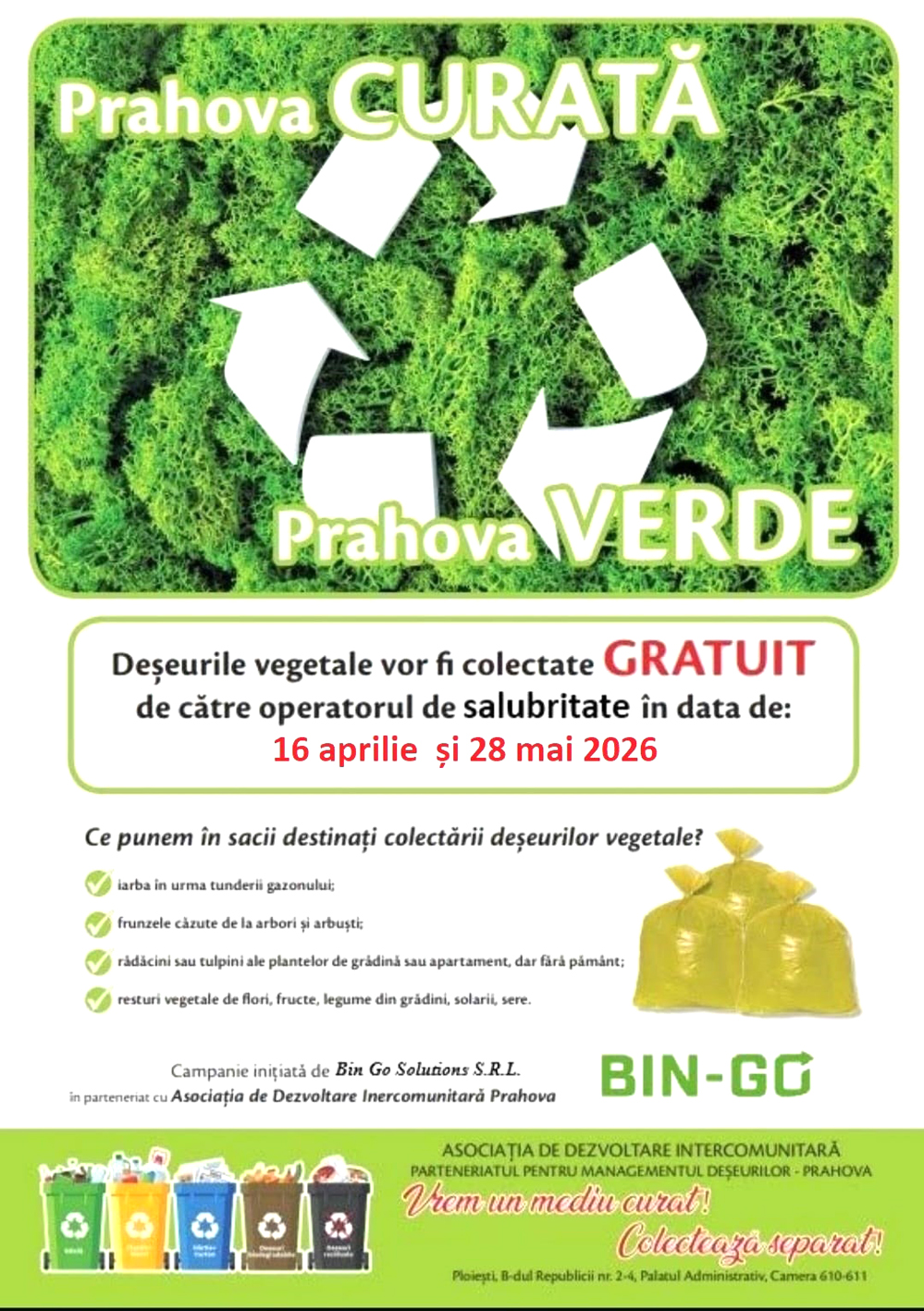 Având în vedere că această perioadă este propice curățeniei de primăvară, operatorul de salubritate BIN Go Solutions vine în sprijinul prahovenilor, în localitățile unde societatea își desfășoară activitatea organizând și o campanie ce vizează colectarea, în mod gratuit, a deșeurilor vegetale. Acțiunile sunt organizate în baza unui program, pe localități și pe zile, astfel că, pe data de 16 aprilie a.c., angajații societății vor fi prezenți la: Gornet, Izvoarele, Măgurele, Predeal Sărari, Posești, Teișani, Păcureți, pe 17 aprilie – la Plopeni, Șiomari, Surani, Ariceștii Zeletin, pe 18 aprilie la Bărcănești, iar pe 19 aprilie la: Aluniș, Bertea, Cocorăștii Mislii, Ștefești, Scorțeni. Saci speciali pentru colectarea deșeurilor vegetale vor fi distribuiți cu o zi înainte de ziua colectării, așa cum reiese, de altfel, și din imaginea alăturată, respectiv din anunțul care face referire la campania de colectare care va avea loc în Măgurele și care este inclusă în acțiunea ”Prahova Curată, Prahova Verde”.