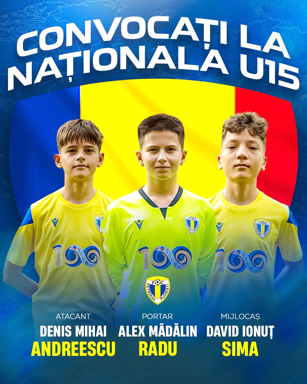 Trei tineri fotbaliști, David Sima, Denis Mihai Andreescu și Mădălin Radu, sportivi în cadrul Academiei Petrolul, au fost convocați la naționala U15 a României! Aceștia au primit vestea participării la un stagiu centralizat în vederea formării lotului național, Petrolul având, în ultima perioadă, constant, tineri fotbaliști care participă la acțiunile loturilor naționale de juniori.