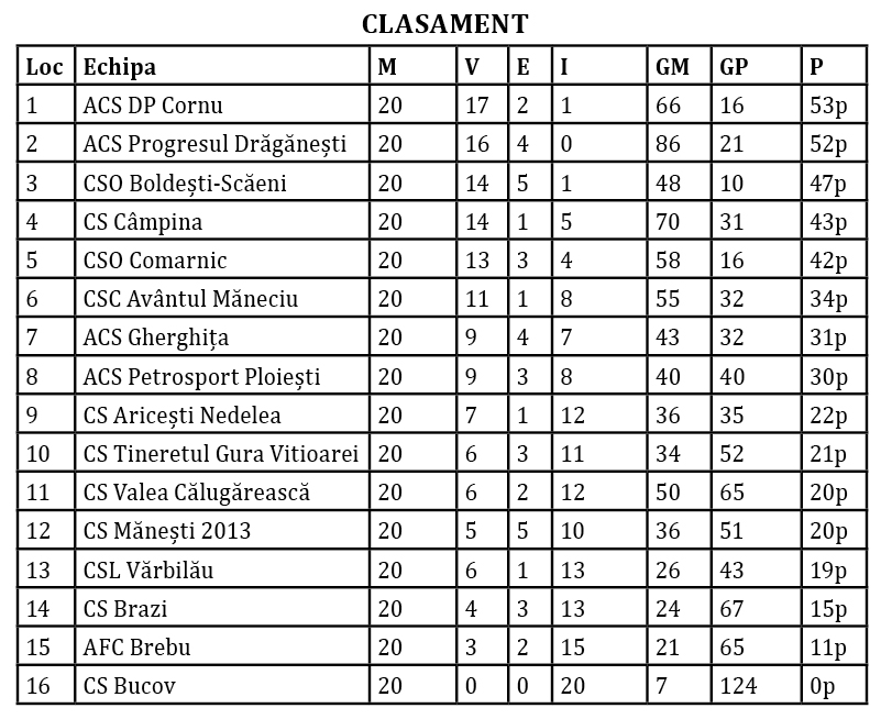 A curs cu goluri în ultima rundă a Ligii a 4-a din județ, unde, în nu mai puțin de 3 meciuri, gazdele au reușit să dea câte 9 goluri, Drăgănești, Măneciu și Valea Călugărească fiind echipele care au umplut poarta adversarelor. În derbiul etapei, CS Câmpina a învins CSO Comarnic și a trecut pe locul 4, dar, clar, lupta pentru barajul de promovare pare că va fi o ”afacere” în maximum 3 echipe – Cornu și Drăgănești, cu Boldești pe post de… ”cârtiță”.
