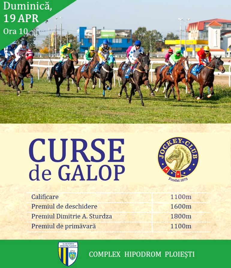 Duminică, 19 aprilie, iubitorii activității hipice sunt așteptați la Complex Hipodrom Ploiești, pentru a marca împreună deschiderea sezonului competițional de galop 2026 și a ne bucura de o nouă serie de curse spectaculoase, cu premii importante pentru câștigători și cu surprize pentru public. Reuniunea din 19 aprilie cuprinde o cursă de Calificare și trei alergări de galop pentru caii Pur Sânge Englez: