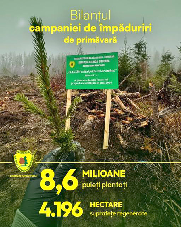 În contextul în care campania de împăduriri de primăvară este în plină desfășurare, până ieri, potrivit unei informări a Regiei Naționale a Pădurilor (RNP), la Direcțiile silvice din țară au fost plantați în fondul forestier de stat circa 8,6 milioane de puieți forestieri, pe aproximativ 1.189 de hectare. De asemenea, pe cale naturală au fost regenerate 3.007 ha, rezultând astfel o suprafață totală regenerată, până ieri, de 4.176 de hectare. În ceea ce privește alte lucrări conexe, respectiv „completări și „refaceri”, acestea au fost efectuate pe 1.387 și, respectiv 548 de ha, rezultând un total de 4.196 hectare fond forestier de stat regenerat. Reamintim că în campania de împăduriri din primăvara acestui an Regia Națională a Pădurilor – Romsilva are în plan regenerarea a 7.112 hectare în fondul forestier proprietatea publică a statului, dintre care 4.520 hectare prin lucrări de regenerare naturală și 2.592 hectare prin lucrări de împăduriri, pentru acestea din urmă urmând a fi utilizați aproximativ 22 milioane de puieți forestieri.