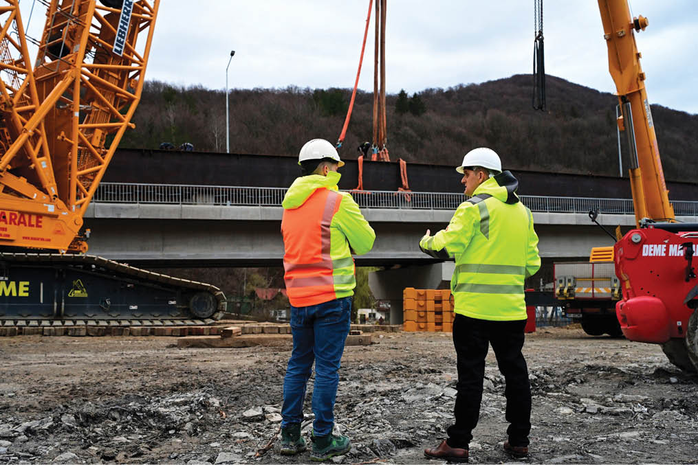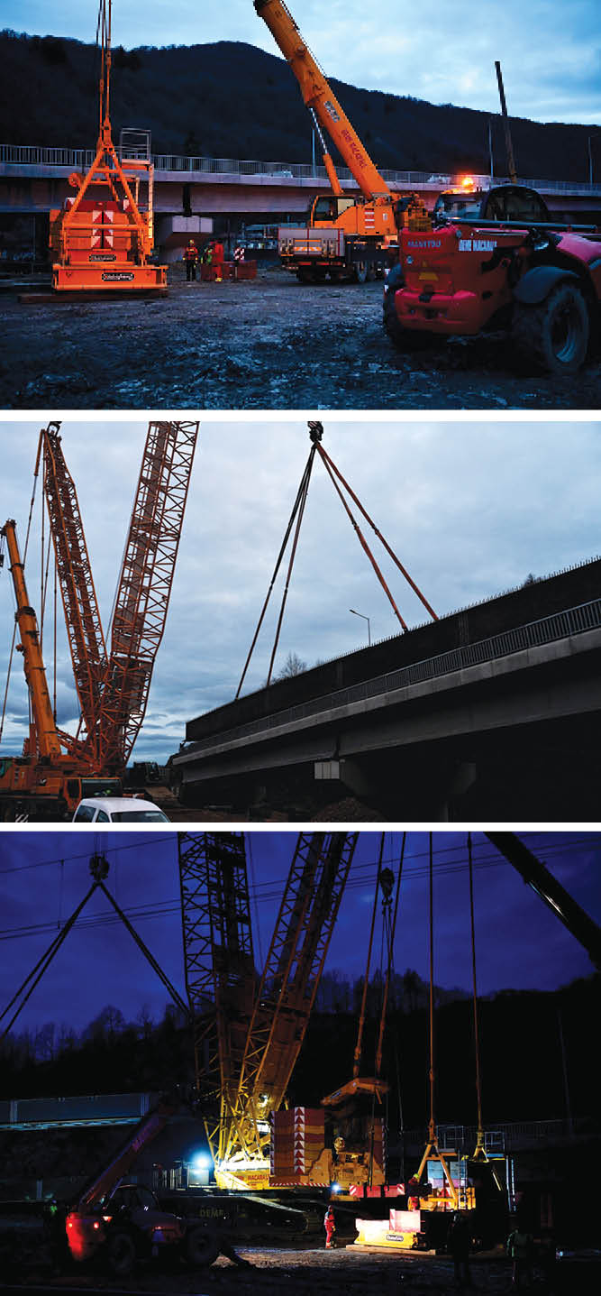Cele două grinzi montate au dimensiuni impresionante – fiecare măsoară 60 de metri lungime și cântărește aproximativ 120 de tone. Acestea reprezintă elemente structurale esențiale ale viaductului, iar instalarea lor a necesitat o coordonare precisă și utilizarea unor macarale de mare tonaj, poziționate cu acuratețe milimetrică. Operațiunea nu a fost doar una spectaculoasă din punct de vedere tehnic, ci și esențială pentru ritmul general al lucrării. Montarea grinzilor face posibilă trecerea la următoarele etape – îmbinarea componentelor, instalarea elementelor secundare și continuarea lucrărilor la suprastructură.