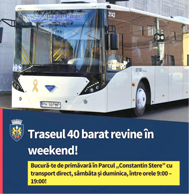 Potrivit Primăriei Ploiești, începând de sâmbătă- 4 aprilie a.c., ploieștenii vor avea acces facil către Parcul Memorial „Constantin Stere” din Bucov, prin intermediul traseului public 40 barat. Autobuzul va circula în zilele sâmbătă și duminică, în intervalul orar 9.00 – 19.00, pe ruta Hale Catedrală – Parc Memorial „Constantin Stere” (în dreptul sensului giratoriu de la intersecția DN 1B cu str. Refractării). Ruta și stațiile aferente traseului 40 barat pe sensul spre Parcul Memorial Constantin Stere sunt: străzile Emile Zola – Erou Călin Cătălin – Ștefan Greceanu – Neagoe Basarab – Buzăului – Poștei – Ștrandului – DN 1B (în dreptul sensului Giratoriu de la intersecția DN 1B cu str. Refractării), stațiile ce vor fi efectuate fiind următoarele: Hale Catedrală, Sf. Vineri, Parc Obor, Complex Bereasca, Ștrand, S.C. Aldini, Intrare Bucov. Pe sensul spre Hale – Catedrală, ruta va fi următoarea: D.N.1B (în dreptul sensului Giratoriu de la intersecția DN 1B cu str. Refractarii) – Ștrandului – Gh. Doja – Poștei – Buzăului – Neagoe Basarab – Gh. Doja – Văleni – Emile Zola, stațiile ce vor fi efectuate fiind următoarele: Intrare Bucov, Ștrand, Complex Bereasca, Hotel Forum, Sf. Vineri și Hale Catedrală – pentru debarcare. ”Precizăm că pentru acces direct către Cartierul Bereasca se va utiliza traseul 40, cu ruta Hale Catedrală – Bereasca și retur, cu intrare prin Bereasca. Acest traseu public poate fi utilizat în intervalul orar 5.30 – 23.12 ”, au mai precizat reprezentanții Primăriei Ploiești.