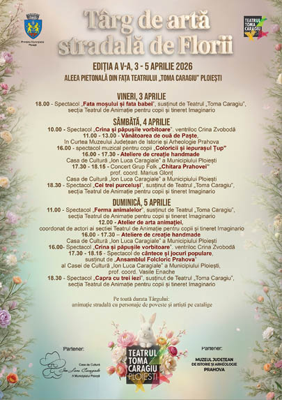 Pentru al 5-lea an consecutiv, la Ploiești va fi organizat Târgul de artă stradală de Florii. Evenimentul, care va avea loc în perioada 3-5 aprilie a.c., este organizat de Teatrul ”Toma Caragiu”, cu sprijinul Primăriei Ploiești, în parteneriat cu Casa de Cultură ”I.L. Caragiale”. ”Vă așteptăm pe aleea pietonală din fața Teatrului ”Toma Caragiu” Ploiești, să ne bucurăm împreună de surprize minunate, într-o atmosferă plină de culoare și veselie. Timp de trei zile, vor avea loc: spectacole de teatru, concerte și momente muzicale interactive, atliere handmade și de artă a animației, tradiționala vânătoare de ouă de Paște, atmosfera de sărbătoare urmând să fie completată de artiști pe catalige și personaje de poveste”, au precizat organizatorii evenimentului menționat. Accesul la toate acțiunile din cadrul Târgului de artă stradală de Florii este gratuit, au mai precizat reprezentanții teatrului ploieștean, care au dat publicității și programul acestora, pe zile și ore, așa cum se poate vedea în imaginea alăturată.