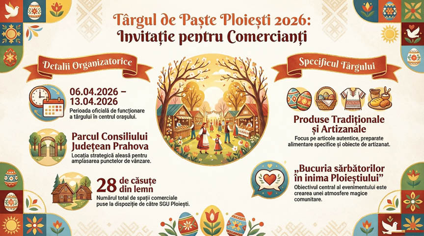 Pe modelul Târgului de Mărțișor, SGU Ploiești va organiza și Târgul de Paște, primul de acest gen, așa cum a fost și la început de primăvară, în centrul orașului, în fața Palatului Administrativ. De fapt, societatea va pune la dispoziția comercianților aceleași căsuțe din lemn care au fost folosite la Târgul de Crăciun și la cel de Mărțișor. ”Cei care sunt gata pentru magia Paștelui pot deveni partenerii noștri la Târgul de Paște 2026! SGU Ploiești invită comercianții și producătorii locali să aducă bucuria Sărbătorilor în inima orașului! Punem la dispoziție 28 de căsuțe din lemn, amplasate strategic în parcul din fața Palatului Administrativ – locul unde comunitatea se întâlnește la început de primăvară. Evenimentul se concentrează în jurul produselor tradiționale, alimentare și artizanale, specifice Sărbătorilor de Paște. Perioada de desfășurare a târgului este 6.04.2026 – 13.04.2026”, au precizat reprezentanții SGU Ploiești, menționând că persoanele care doresc să se înscrie se pot adresa societății prin intermediul poștei electronice, la email: secretariat@sguploiesti.ro, sau personal la sediul din Str. Văleni nr. 44, la Registratură, iar pentru detalii contractuale, echipa de la Compartimentul Comercial va răspunde prin intermediul adresei de email contracte@sguploiesti.ro. Potrivit Regulamentului de organizare și funcționare al Târgului de Paște 2026, la acest eveniment pot participa persoane juridice legal constituite, care desfășoară activități comerciale conforme profilului evenimentului sau meșteșugari ce dețin atestate de producători, participarea fiind realizată exclusiv pe baza formularului tip de înscriere pus la dispoziție de pe site-ul sguploiesti.ro. Înscrierile au început pe 30 martie și se vor încheia pe data 3 aprilie 2026, ora 13:00, iar formularul de înscriere completat se depune la registratura societății sau prin e-mail la adresa secretariat@sguploiesti.ro. ”Cererile se înregistrează cu număr și ora exactă a depunerii, în ordinea cronologică a primirii acestora. Solicitanții pot opta pentru una dintre următoarele categorii de căsuțe: 4 m × 2m; 3 m × 2,5m. Opțiunea exprimată are caracter orientativ și nu constituie garanția atribuirii tipului de căsuță solicitat, alocarea realizându-se în limita disponibilității. Niciun comerciant nu poate închiria mai mult de două căsuțe, iar tarifele sunt următoarele: căsuță 4 m × 2 m – 932, 23 lei TVA inclusă; căsuță 3 m × 2,5 m – 899,97 lei TVA inclusă. Toate căsuțele sunt racordate la rețeaua de energie electrică. Pentru consumul de energie electrică se percepe o garanție de 100 lei, distinct de taxa de participare. Atribuirea căsuțelor se realizează în ordinea înregistrării cererilor, în limita spațiilor disponibile. Organizatorul stabilește amplasarea comercianților în funcție de configurația amplasamentului, echilibrul categoriilor de produse și necesitățile logistice. Comercianții își desfășoară activitatea exclusiv în perimetrul căsuței atribuite, fiind interzisă extinderea spațiului expozițional în afara perimetrului acesteia. Târgul de Paște este destinat activităților de comerț cu produse alimentare, produse handmade și cadouri specifice Sărbătorilor Pascale”, se mai precizează în Regulamentul de organizare și funcționare al Târgului de Paște 2026, care va fi organizat de SGU Ploiești.