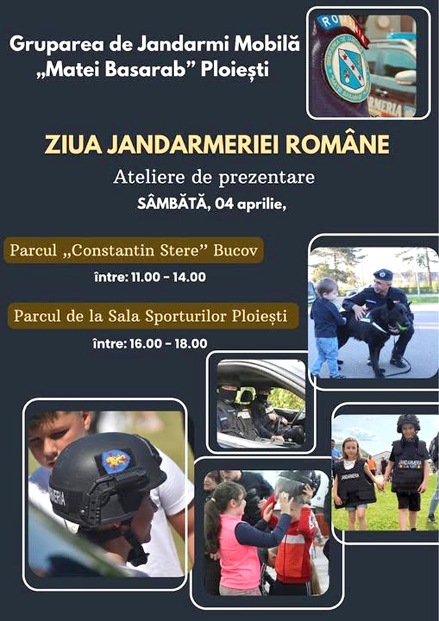 Deşi Ziua Jandarmeriei Române este sărbătorită vineri, 3 aprilie a.c., reprezentanţii Grupării Mobile „Matei Basarab” Ploieşti îi invită pe prahoveni şi sâmbătă, 4 aprilie, începând cu ora 11:00, în Parcul Memorial „Constantin Stere“ de la Bucov, iar de la ora 16.00, în Parcul de la Sala Sporturilor din Ploiești, la un eveniment dedicat acestui moment aniversar.